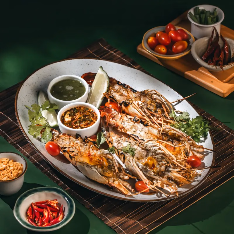 Jumbo Prawn refers to very large prawns, usually served as a premium seafood dish. They are prized for their big size.Grilled jumbo prawn served with sweet chili tamarind herb dip and lime chili dip.